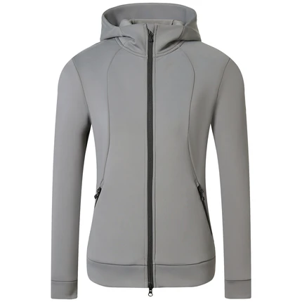 Sportliche Hoodyjacke, die durch ihren femininen, taillierten Schnitt besticht. Das sportliche Material sorgt für eine bequeme Passform.