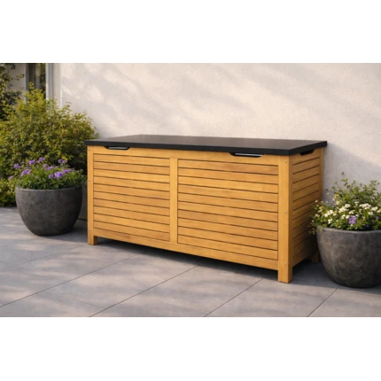 Die Gartentruhe »Java« ist eine praktische und stilvolle Aufbewahrungslösung für Garten, Terrasse oder Balkon. Sie bietet ausreichend Platz für Sitzauflagen, Gartenaccessoires oder andere Utensilien und überzeugt gleichzeitig durch ihre hochwertige Optik. Das stabile Gestell aus FSC-zertifiziertem Akazienholz im Teak-Look sorgt für eine natürliche Ausstrahlung, während der pulverbeschichtete Metalldeckel für zusätzliche Stabilität und Witterungsbeständigkeit sorgt. Dank der Gasdruckfedern lässt sich der Deckel besonders leicht öffnen und schließen. Ein spritzwasserfester Innensack schützt den Inhalt zusätzlich vor Feuchtigkeit.