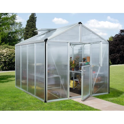 Das Gewächshaus Profi überzeugt mit einer besonders stabilen Konstruktion und viel Platz für ambitionierte Hobbygärtner. Die Verglasung wird an den Seiten mit verschraubten Aluminiumleisten befestigt, während im Dachbereich eine innovative Einschubtechnik zum Einsatz kommt. Die UV-stabilisierten 10 mm Hohlkammerplatten sind schlagfest, weitgehend bruchsicher und verfügen über 10 Jahre Garantie gegen Verwitterung. Gleichzeitig reduzieren sie den sogenannten Brennglaseffekt und schaffen ein angenehmes Klima für deine Pflanzen. Mit einer Firsthöhe von 2,50 m und einer Traufenhöhe von 1,89 m bietet das Gewächshaus besonders viel Bewegungsfreiheit.